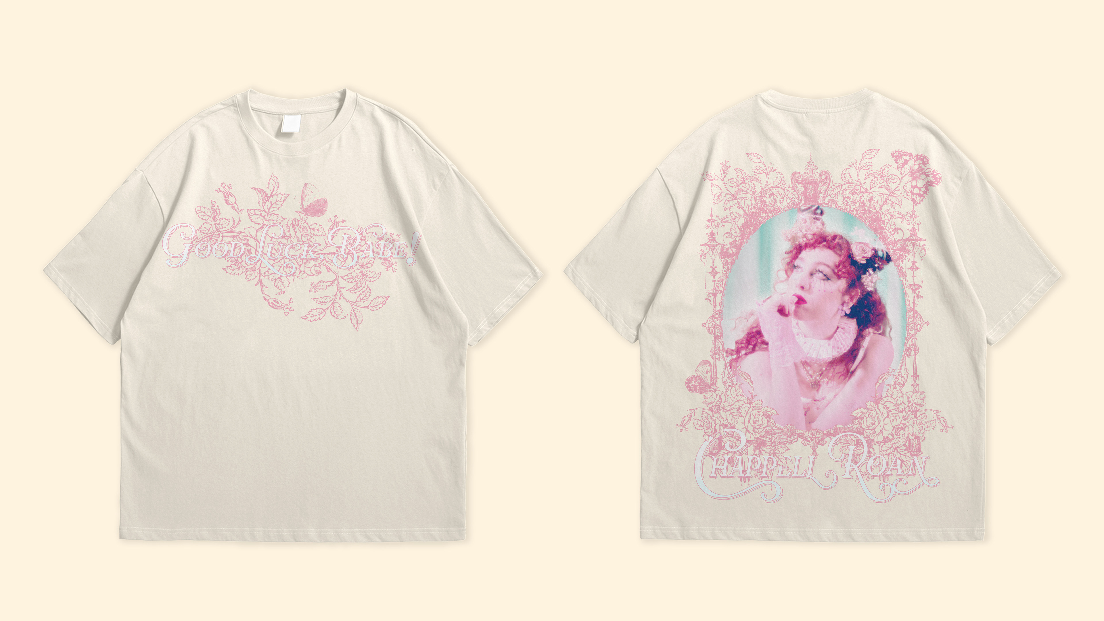 I was heavily inspired by Chappel Roan's album “The Rise and Fall of a Midwest Princess,” so I wanted to design a poster and a matching shirt design for it. To encompass the princess vibe, I added a vintage, delicate frame, which I decorated with thorny roses and butterflies. Finished it off with the almost western-style font.